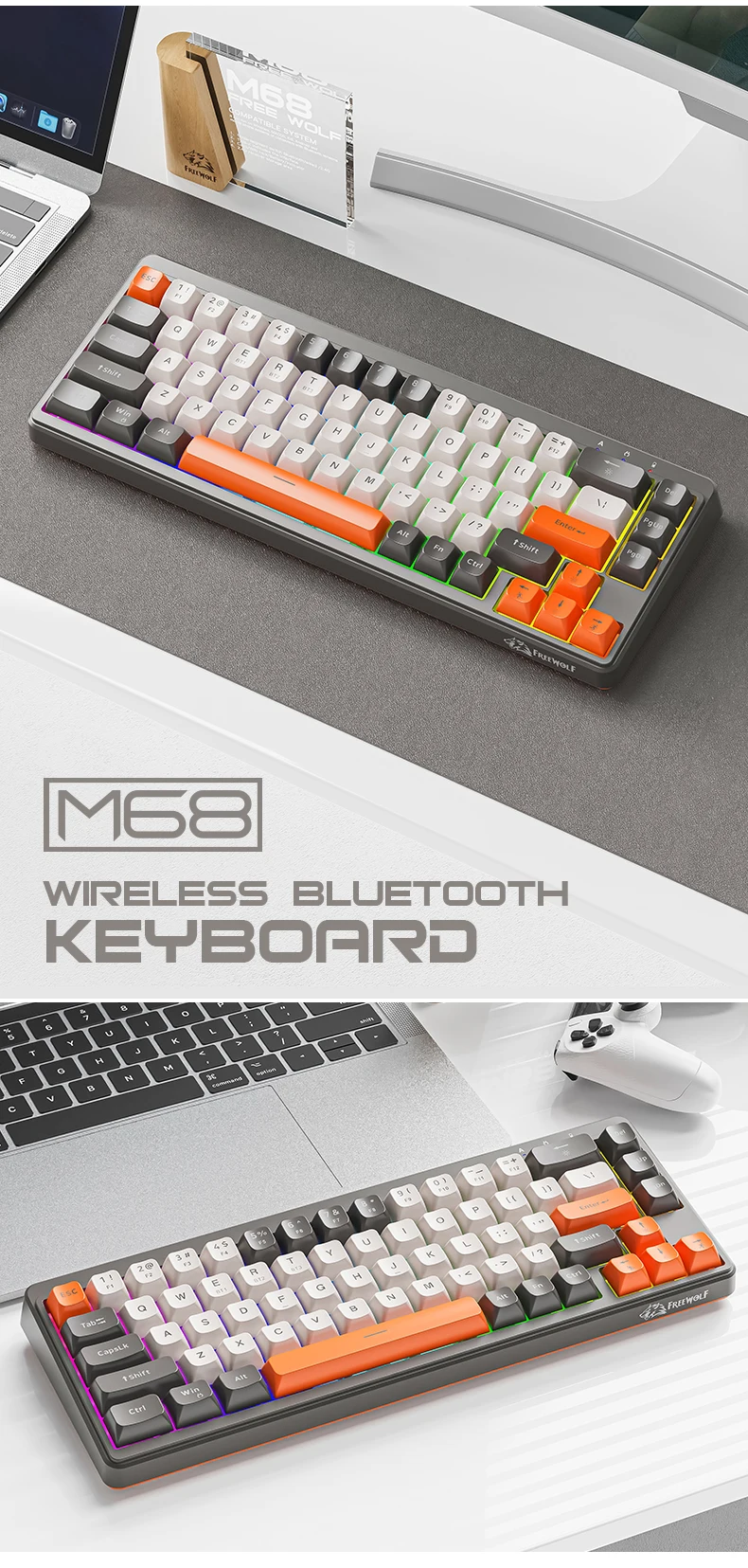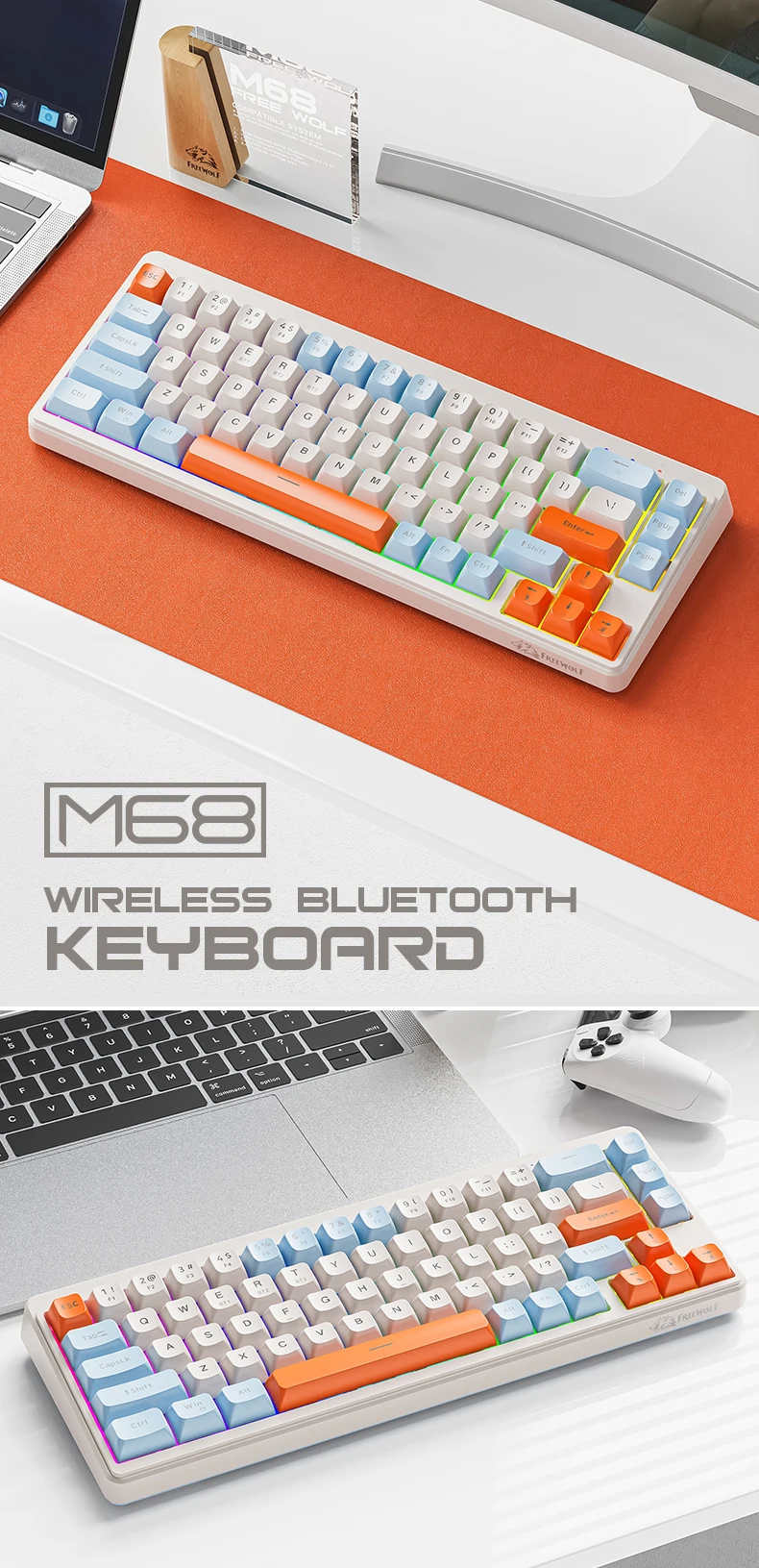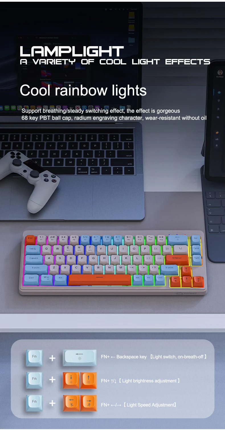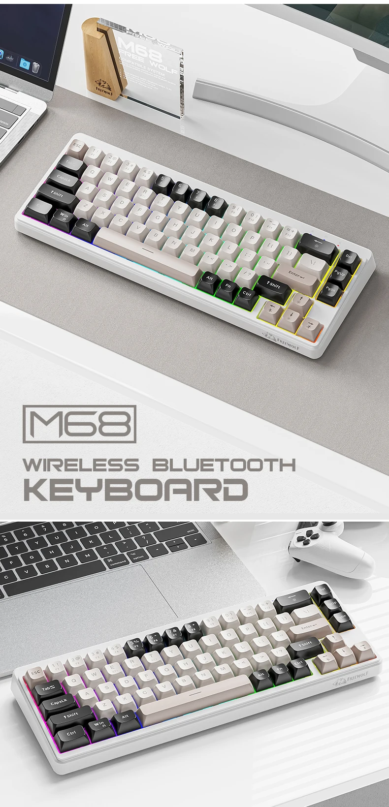 M68 Gaming Wireless Keyboard,Bluetoot Tri-Mode Connection, PBT Ball Cap, Rainbow Light, Suitable for Computers, Laptops, and Mac