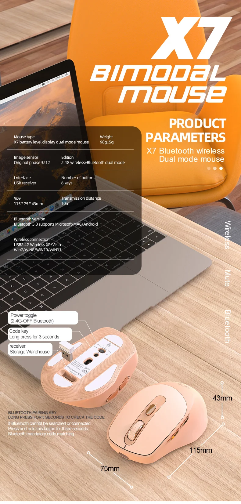 X7 Bluetooth Wireless Mouse Mice With Battery Indicator 5 Adjustable DPI for Windows Android Mac